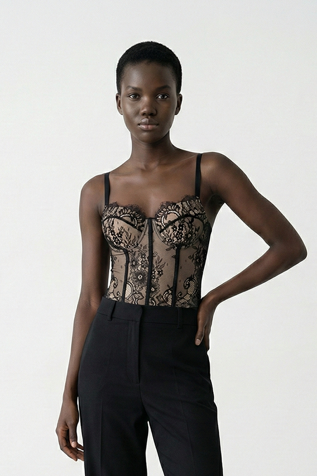 Yarı saydam dantel, iç kısmı hafif astarlı ve balenli. Esnek değildir.