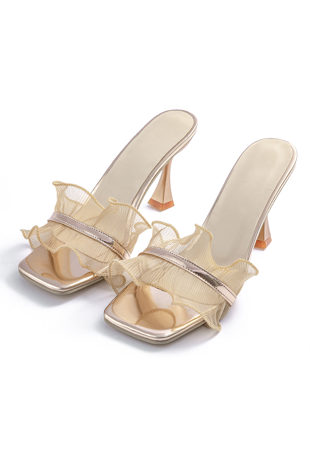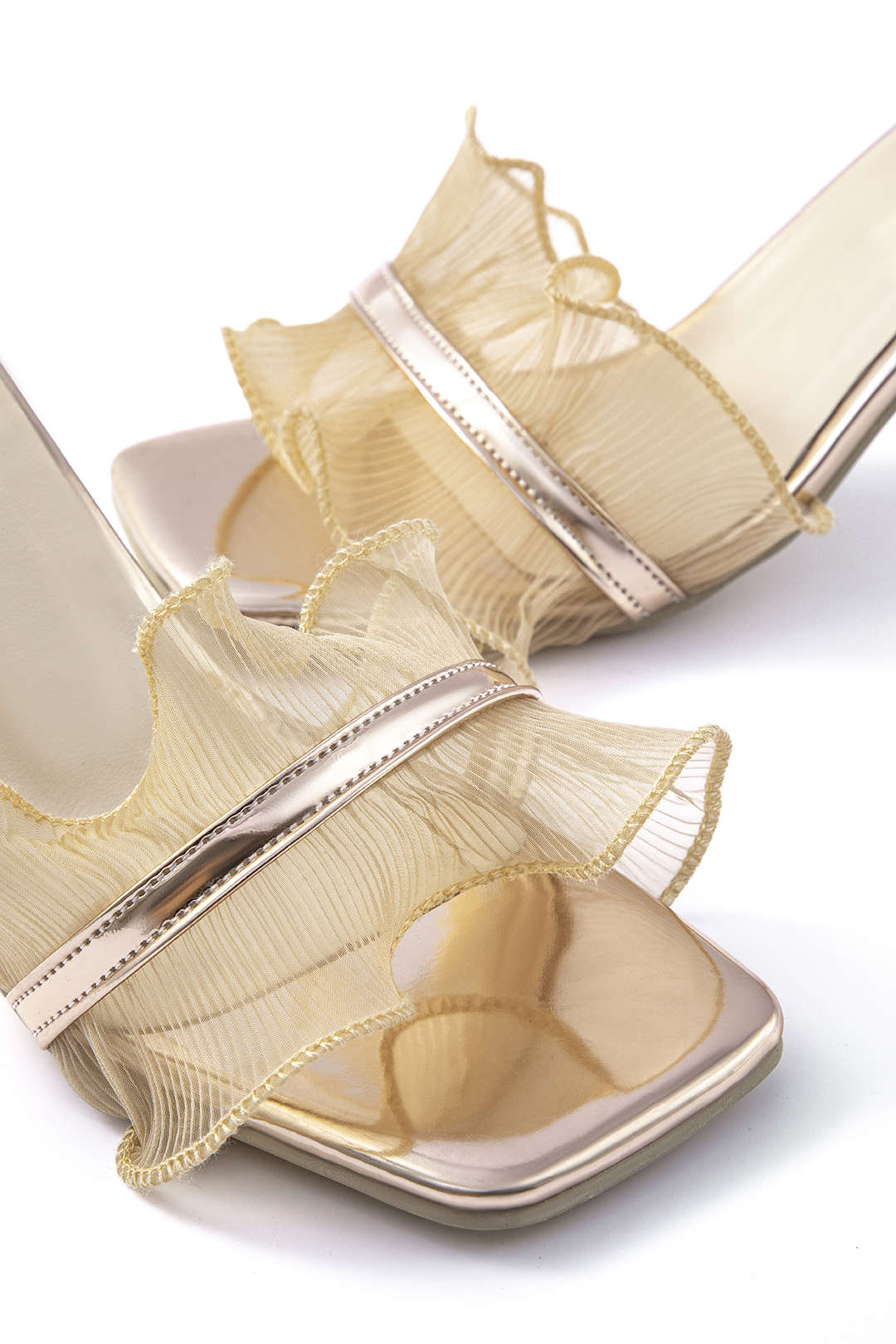 Şampanya rengi fırfırlı topuklu ayakkabılar, modern kadınsılığı ve incelikli zarafeti temsil ediyor.