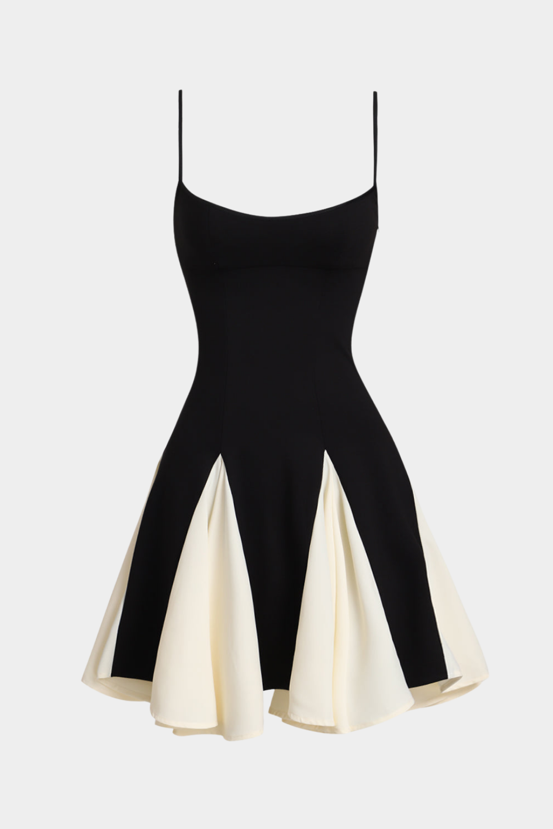 Bu mini elbise, çarpıcı kontrast panelleri ve şekillendirilmiş silüetiyle öne çıkıyor. Vücuda oturan üst kısmı, yumuşak bir şekilde genişleyen eteğe dönüşerek, yapı ve hareket arasında cesur ama zarif bir denge yaratıyor. Modern ve kendinden emin bir tasarıma sahip olan bu elbise, iddialı anlar için tasarlandı; zarafeti kendine özgü bir tarzla birleştiren Vandoria kadını için vazgeçilmez bir parça.