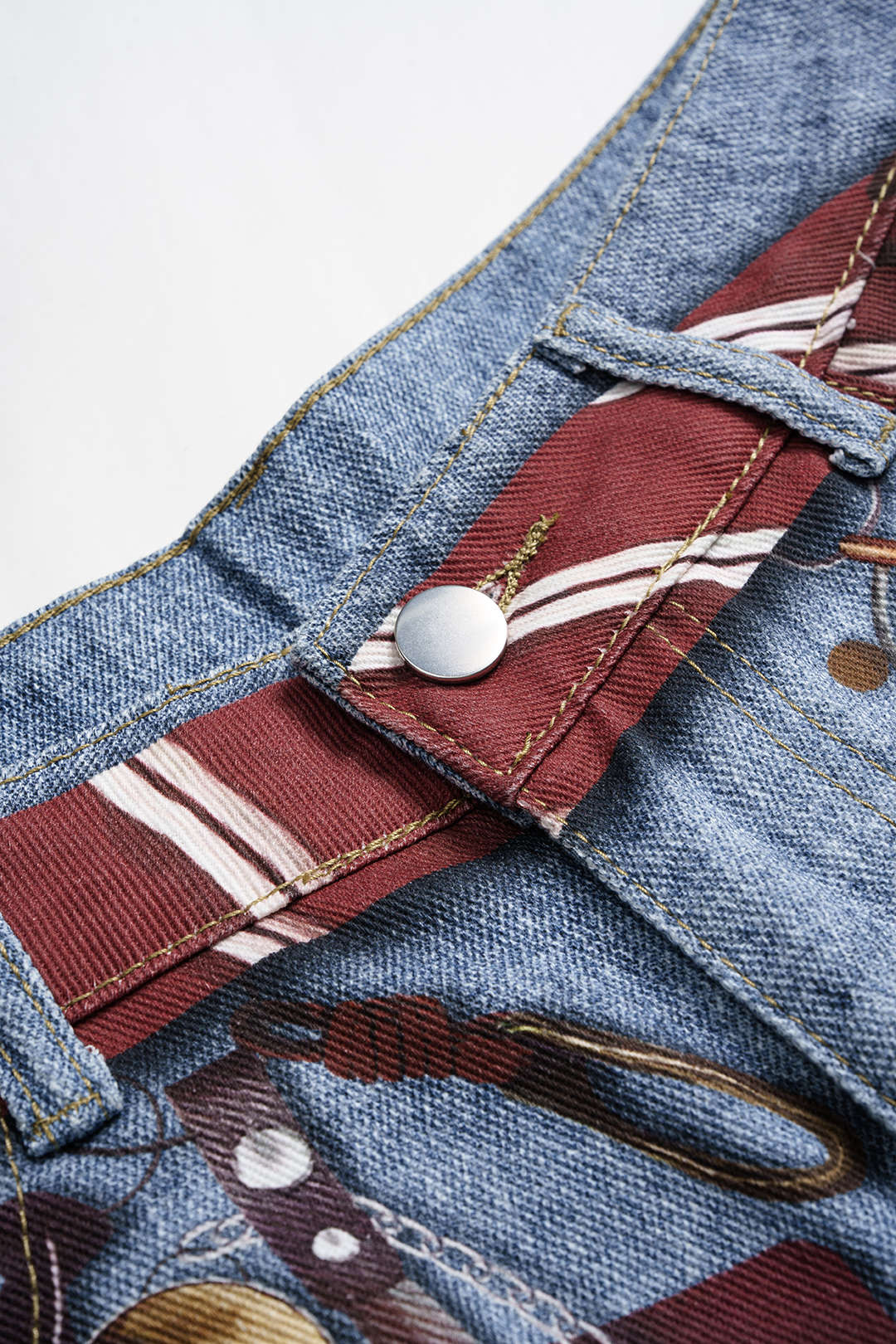 Açık mavi kot kumaş, çeşitli aksesuar detaylarıyla tamamlanmıştır.