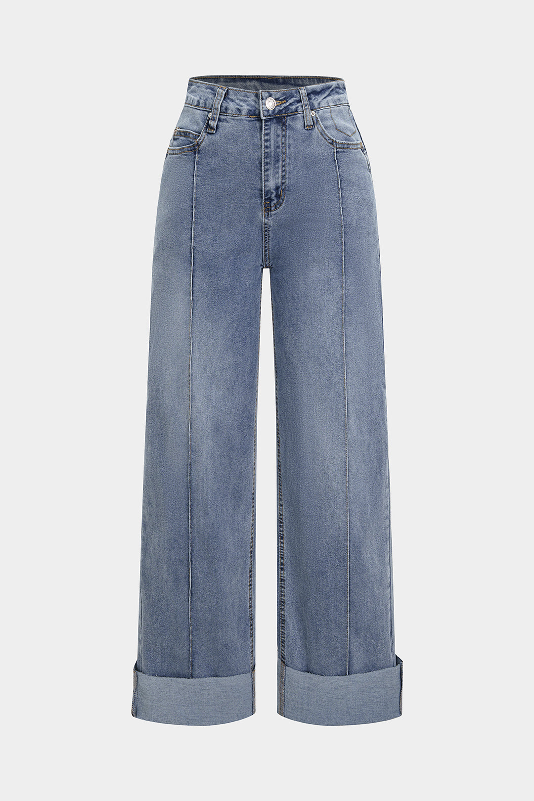 Yüksek belli, düz ve geniş paçalı kesim ve dikkat çekici manşetli paçalar. Dikey dikiş çizgileri yapıyı güçlendirir ve vücudu daha uzun gösteren, zarif bir silüet yaratır.