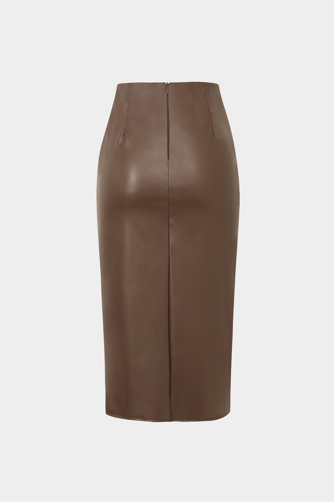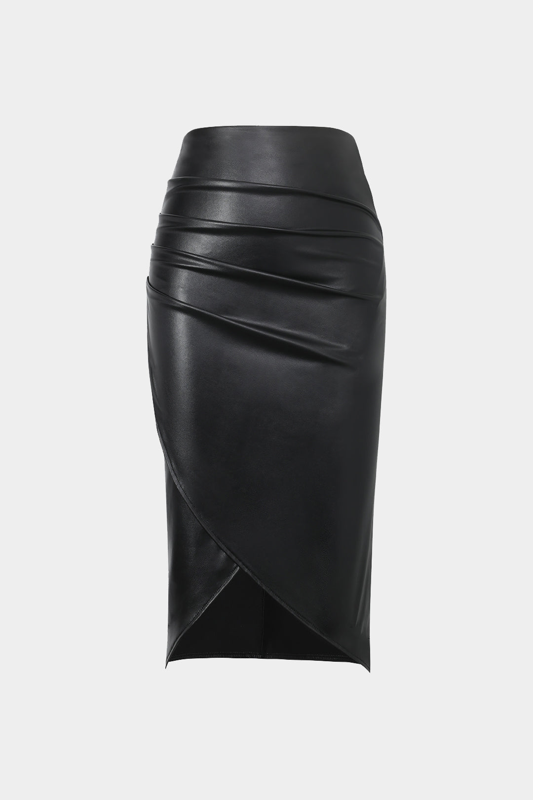Bu asimetrik deri midi etek, Vandoria kadınının gardırobuna cesur bir zarafet katıyor. Şekillendirilmiş kruvaze tasarımı ve sade çizgileri, modern bir dokunuşla kendinden emin, uzun bir silüet yaratıyor. Şık şehir stilleri veya iddialı akşam görünümleri için ideal olan bu etek, dar kesimli üstlerle veya özel dikim dış giyimle zahmetsizce kombinlenebilir. Çağdaş zarafeti tavırla benimseyen kadınlar için güçlü bir temel parça.