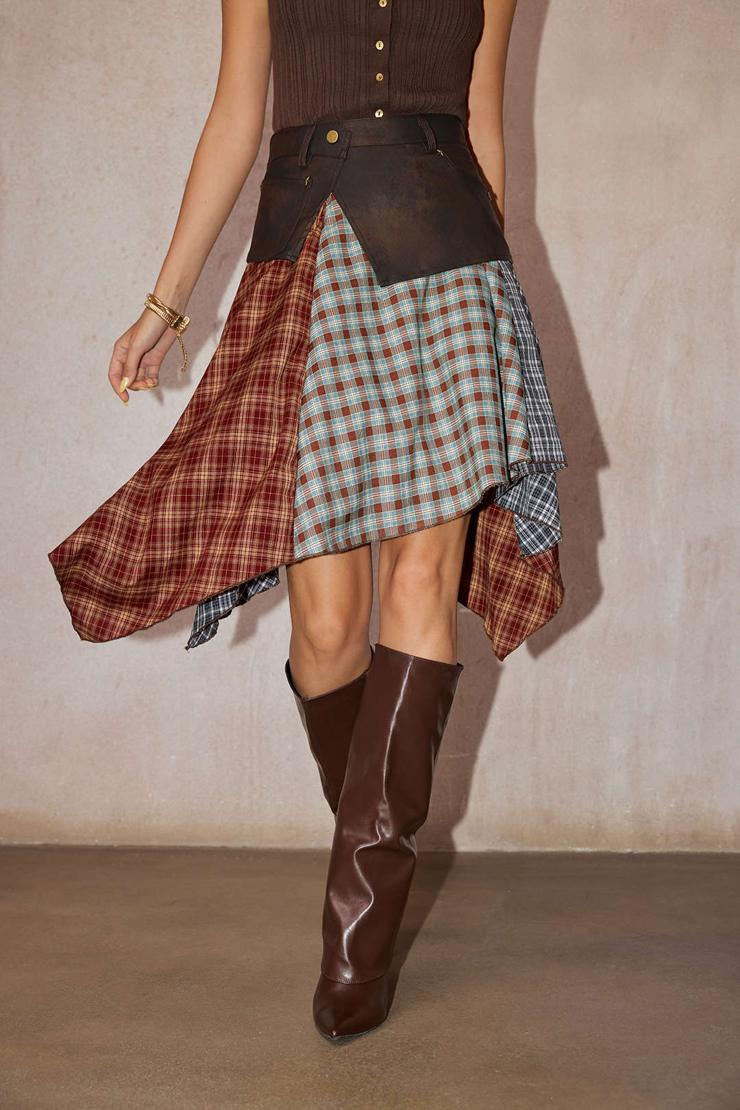 Bu patchwork midi etek, Vandoria kadınının gardırobuna sanatsal bir bireysellik katıyor. Katmanlı doku ve desen karışımı, cesur ve etkileyici bir silüet oluştururken, yapılandırılmış bel kısmı da zarif bir dengeyle görünümü tamamlıyor. Yaratıcılığı özgüvenle kucaklayan kadınlar için tasarlanan bu etek, günlük stili modern kadınsılığın bir ifadesine dönüştürüyor. Karakter ve amaçla giyinenler için ayırt edici bir parça.